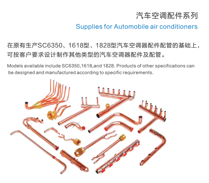 在原有生产SC6350、1618型、1828型汽车空调器配件配管的基础上,可按客户要求设计制作其他类型的汽车空调器配件及配管。